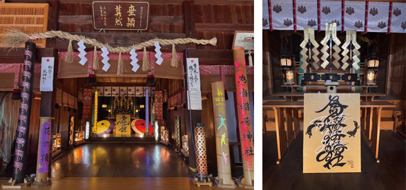 社殿に約30本の竹灯籠が飾られ常時観覧することができます。また、正面奥には、名古屋を拠点に活動するグラフィックデザイナーの安藤徹平さんによるデザインパネルが置いてあります。